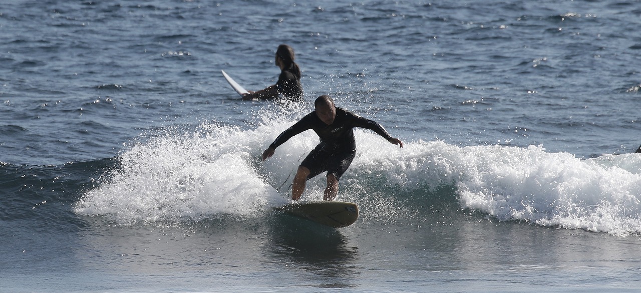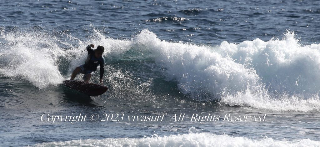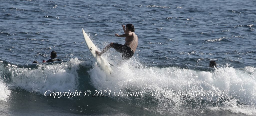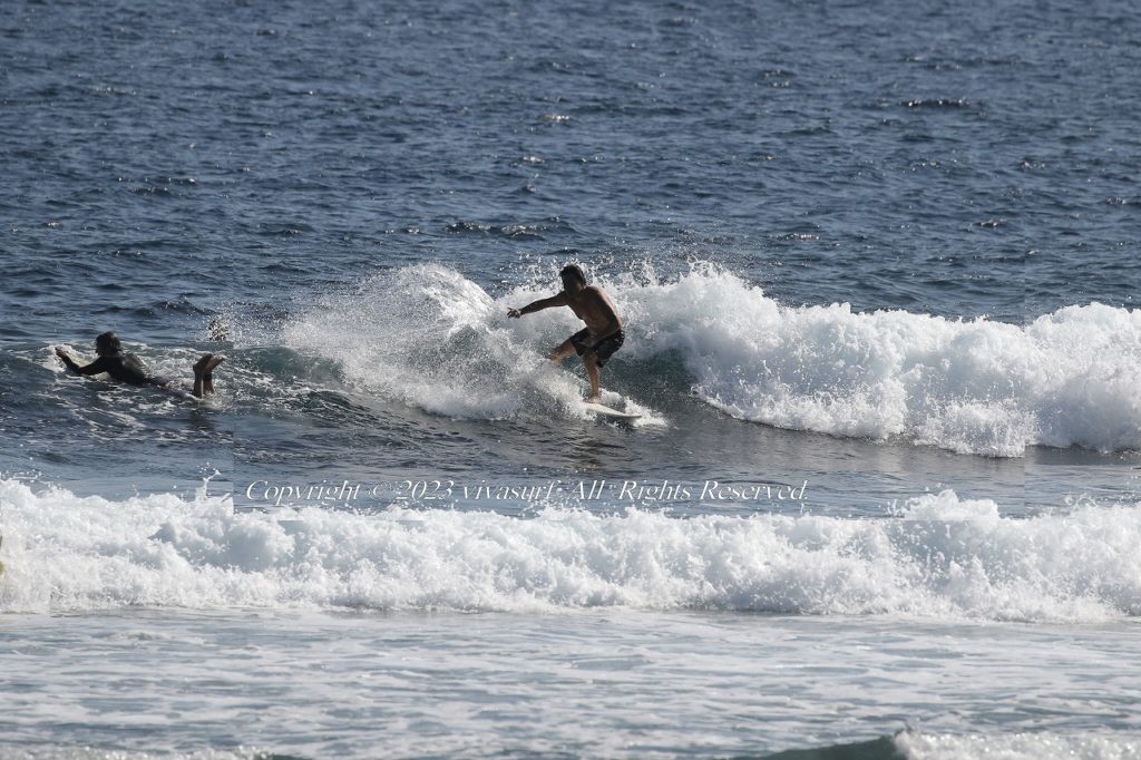 波サイズは腰〜胸程度で、パワーは弱め。 北東の風が強いため、面はやや乱れやすい状況。